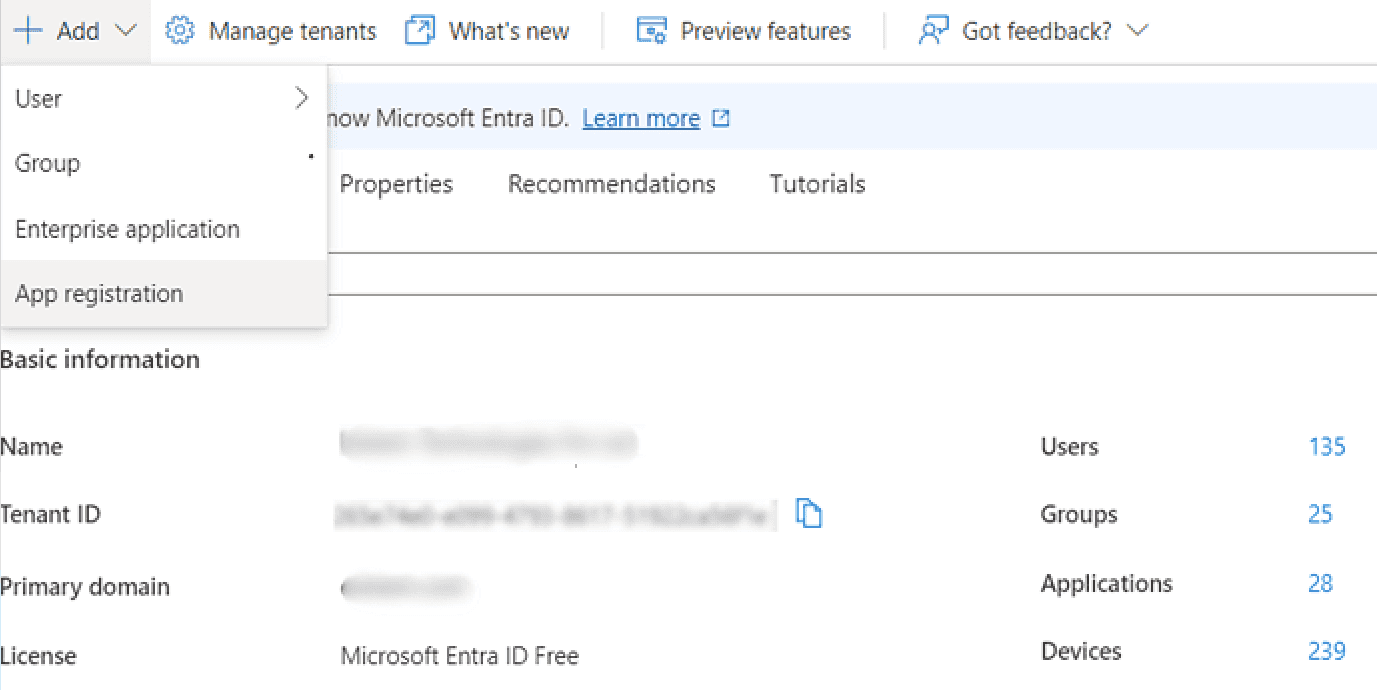 First, we need to have an Azure Subscription or a free Azure account. The account must have permissions to register an application. From the Home page, we can select the service Microsoft Entra ID. Here we can view the Tenant Id of the account and add a new App Registration.