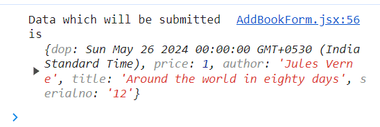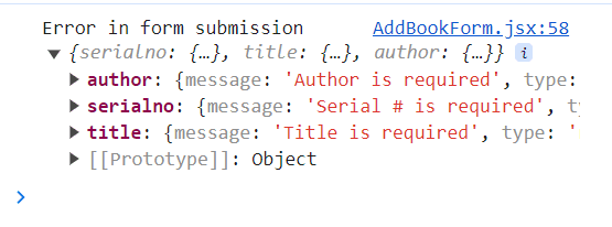 Normally form submission is handled by a submitHandler function which will calls an API and will contain both the success and error paths. With react-hook-forms, there is a small difference. The submitHandler function will handle only success path and a separate errorHandler function will handle the error path. Both these handler functions are provided as input to the form's handleSubmit method. Form data is available as data object to the submitHandler function. Similarly, errors object is available to the errorHandler function. In our example, handler functions will just print the data and the errors object. In actual application, submitHandler will call the post API to create a new book record in the database. Within the errorHandler, further processing can be done or the error message can be displayed in application or logs.