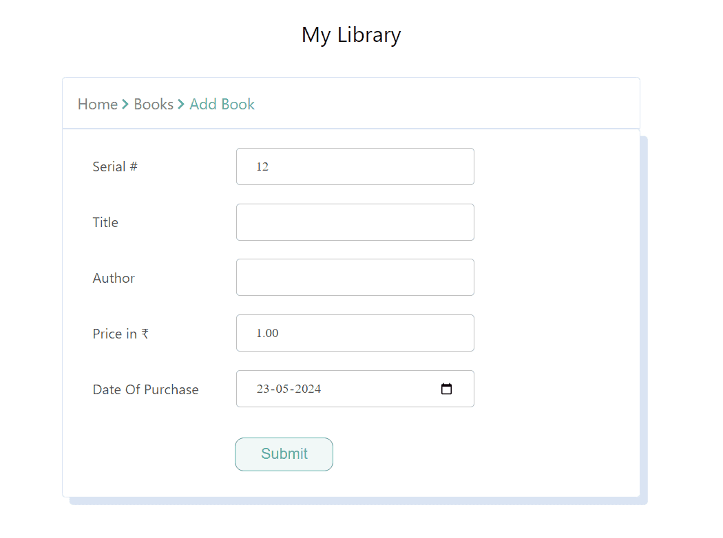 Let us take the example of a form within a library application. This form will be used to add new book details to the application. We can have following fields :